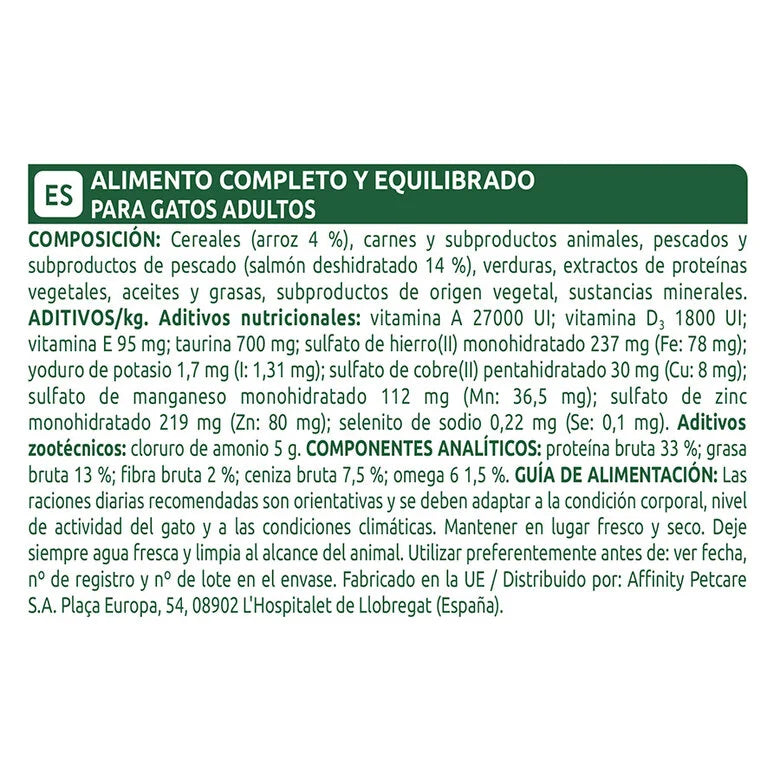 - Salmón como ingrediente principal: Rico en ácidos grasos omega 3 y 6, que mejoran la digestión, cuidan la piel y el pelaje, y ayudan a eliminar las bolas de pelo.
